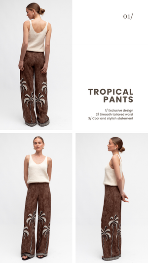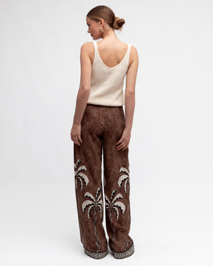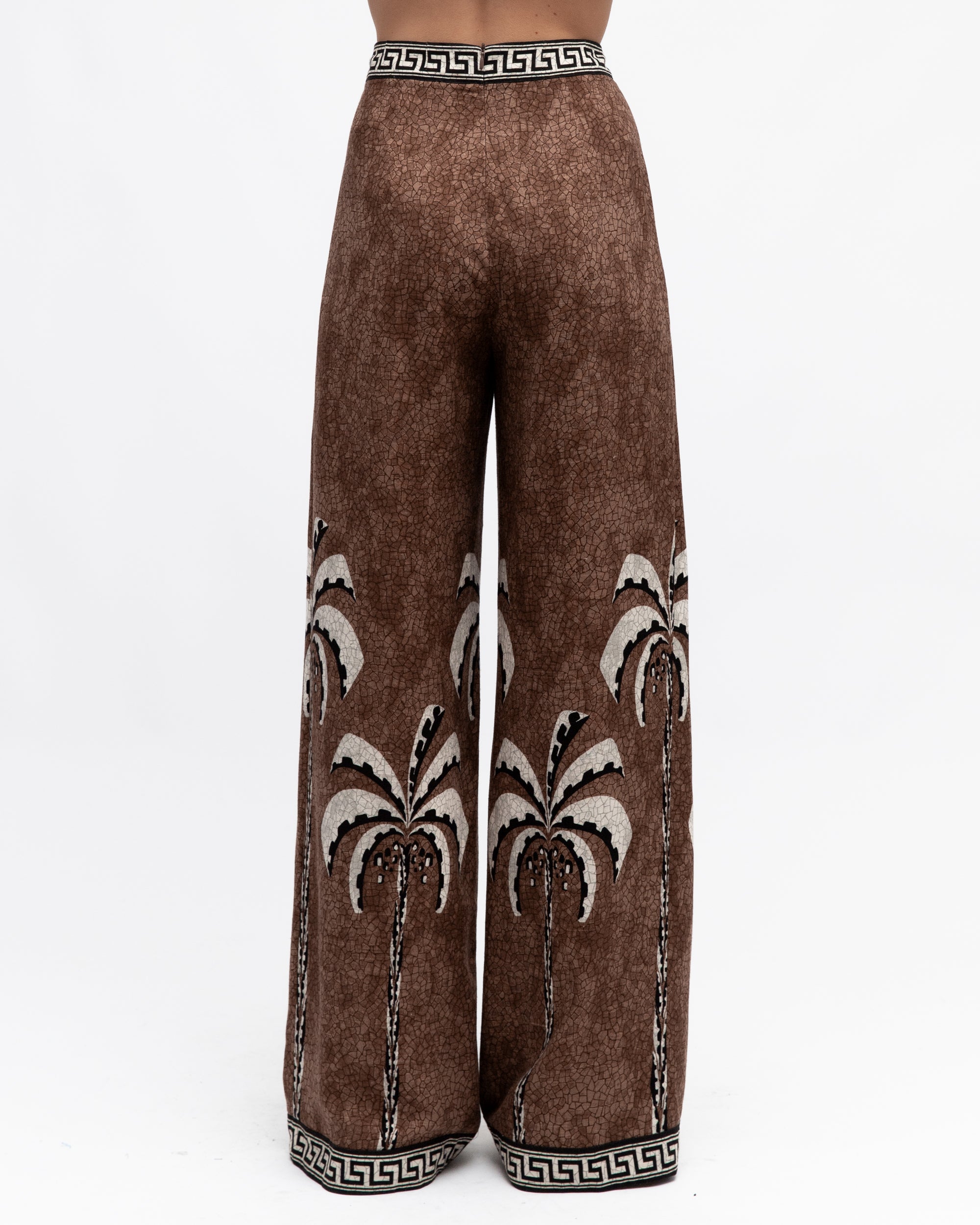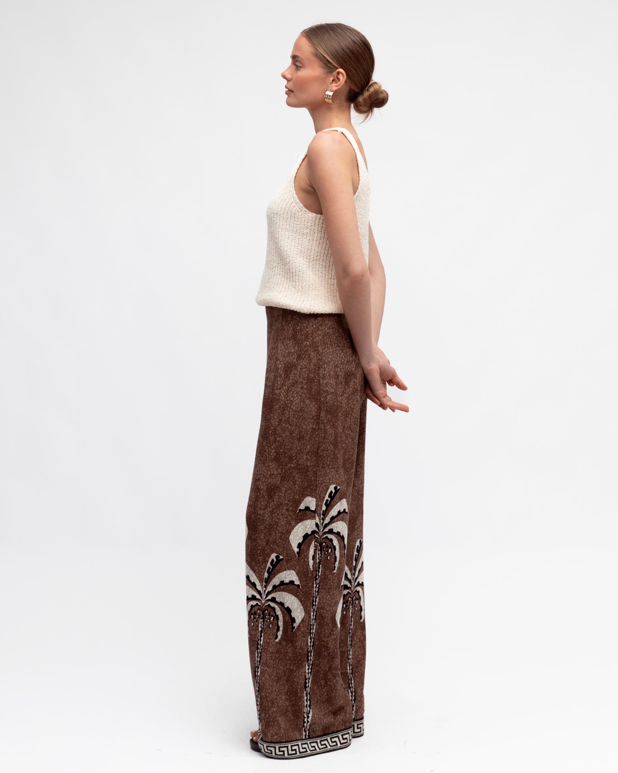 Its exclusive print, in warm coconut husk tones, is layered with tribal and palm motifs — a nod to tropical landscapes and timeless craftsmanship. The high fitted waist and hip provide the silhouette with clean, modern lines. The back zip, flowing fuller leg from fitted hip provide function and flourish.