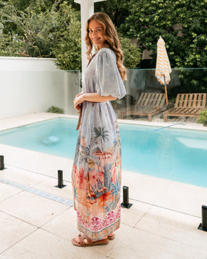 The print — inspired by faraway landscapes and desert mirages — lends a sophisticated, worldly edge. Discreet pockets and considered sleeves ground the look in effortless practicality, while its versatility makes it equally at home in the office, wandering city streets, or escaping to resort evenings.