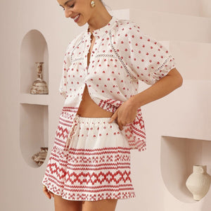 A blouse with main-character energy. Ladder-lace detail, puff sleeves and a neat stand collar say “I woke up chic.” Soft fabric and relaxed cut say “I’m also very comfy.”