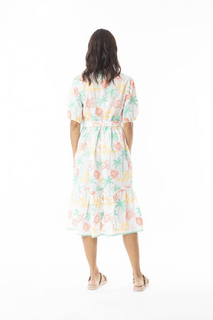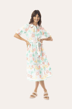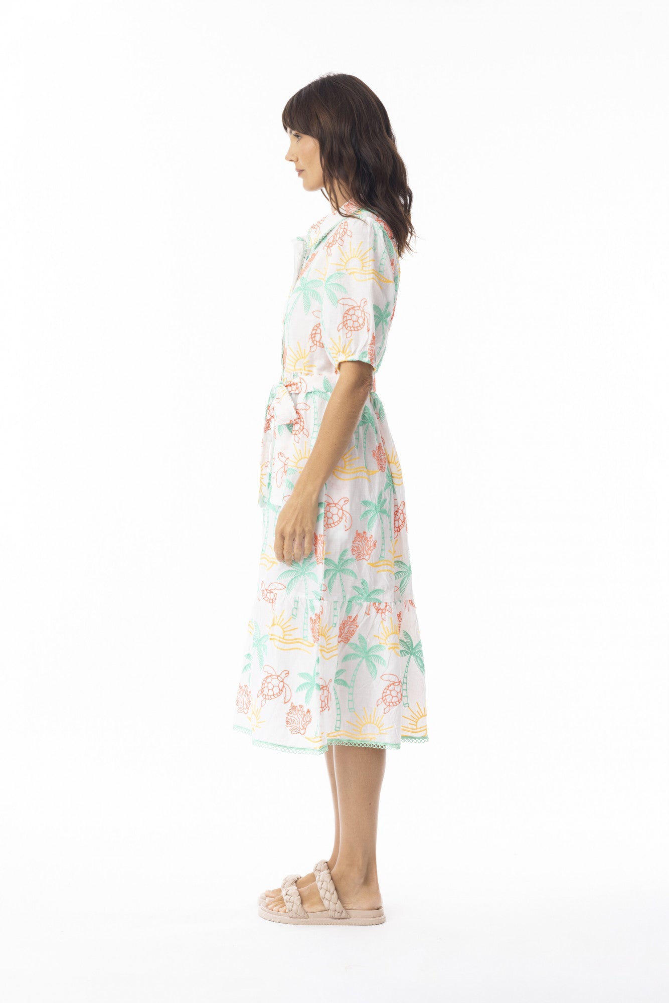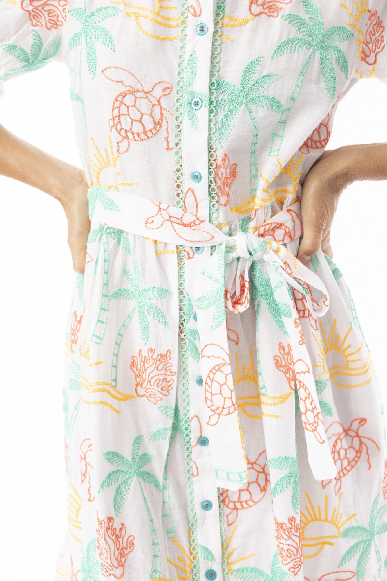 Whisk yourself away with the horizon-chasing Coral Collar Elbow Sleeve Dress. This dress features a unique embroidery feature design of sunny palms, sea turtles, and coral. It includes graceful gathered half sleeves, a flattering fabric tie belt, and a playful frill hem, perfect for an ocean-inspired escape.