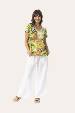 Embrace the spirit of faraway places with the whispering V neck T Shirt, showcasing beautiful prints. This top features a flattering V-neckline, comfortable short sleeves, a versatile waist length, and a wonderfully relaxed fit, perfect for your wanderlust.