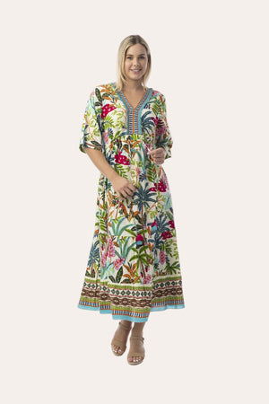Add some fun to your everyday style with our Ovahe Maxi Trim Dress . Featuring a flattering V-neckline and three-quarter sleeves, it offers both style and comfort. The gathered seam under the bust flows effortlessly into a graceful maxi skirt, creating a timeless silhouette.