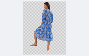 Woman wearing a blue floral dress on a transparent background