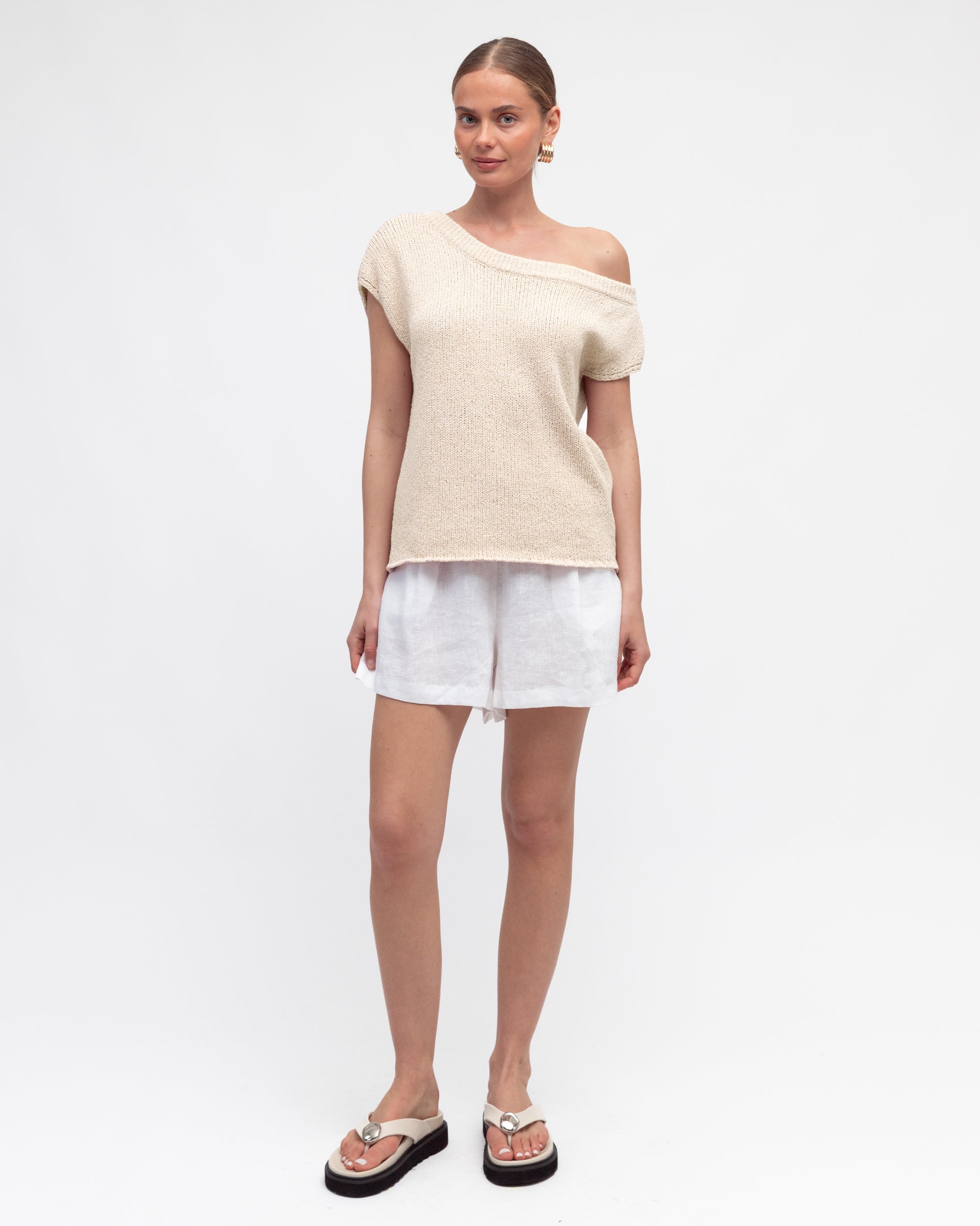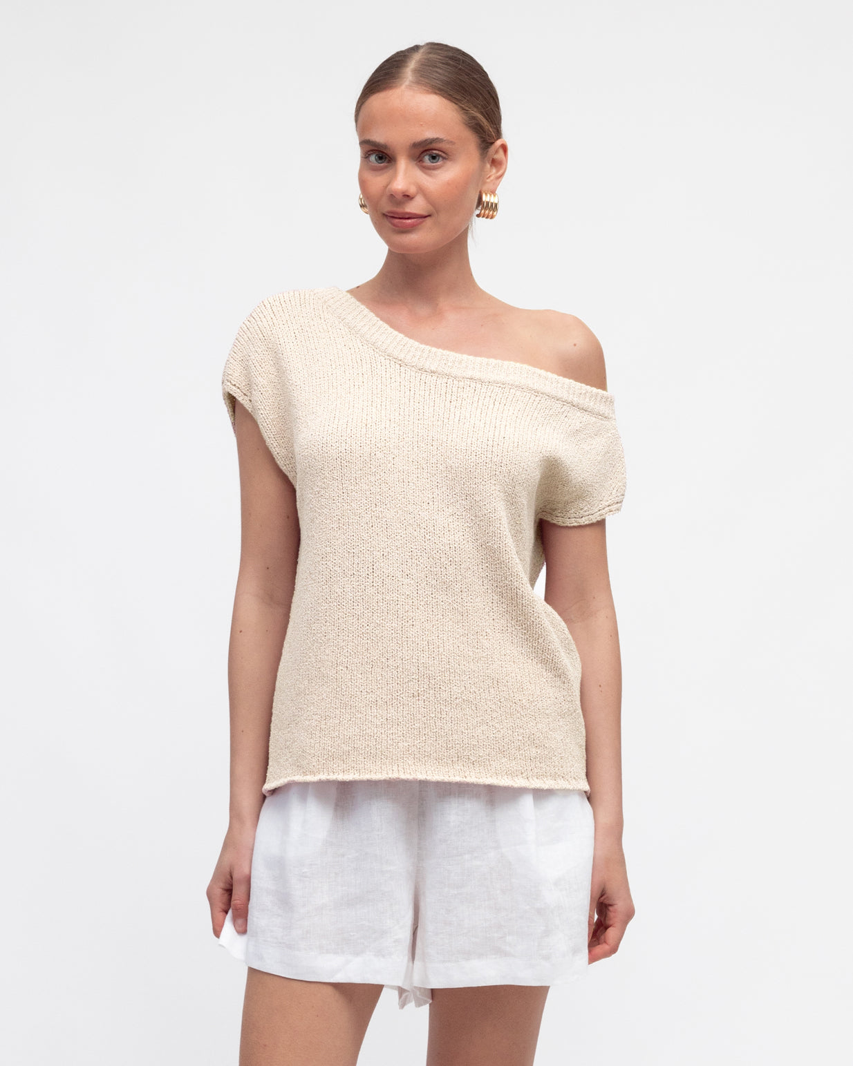 The natural off-white shade feels timeless and luxurious, pairing seamlessly with tailored pants, a flowing skirt, or casual summer shorts. Subtle in its simplicity, it carries an understated elegance that transitions with ease from day to evening.